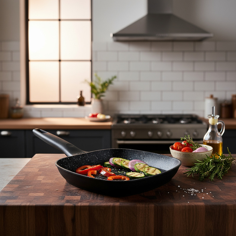Su forma cuadrada y dimensiones amplias hacen que sea ideal para elaborar una variedad de platos, desde deliciosas carnes hasta sabrosas verduras. El mango de acero garantiza un agarre seguro y cómodo durante su uso, mientras que su diseño elegante se integra a la perfección en cualquier cocina.